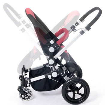 A unique infant to toddler system that can be used with a bassinet or with a seat. Has a height adjustable reversible handlebar and adjustable swivel front wheels. Stroller has an adjustable/reverseable/removeable seat and bassinet so that the child can face either way. Seat has three position tilting and a five point safety harness. Parking brake on handlebar. Includes a canopy wih peek a boo window. Aluminum base chasis with wheels, seat and bassinet frame, carry handle and underseat basket.